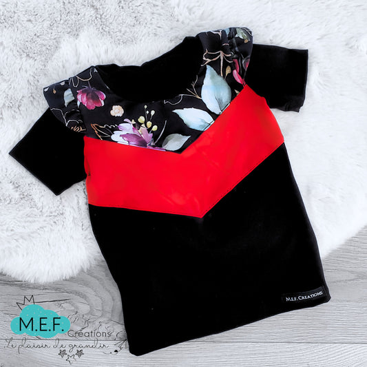 T-shirt fillette fleuris Noël, découpe en V, rouge vif ou bourgogne