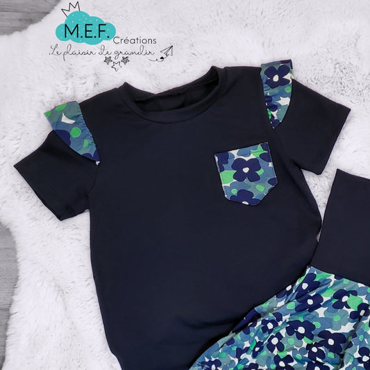 Ensemble fillette fleuris marine et vert, 5 à 7 ans LIQUIDATION