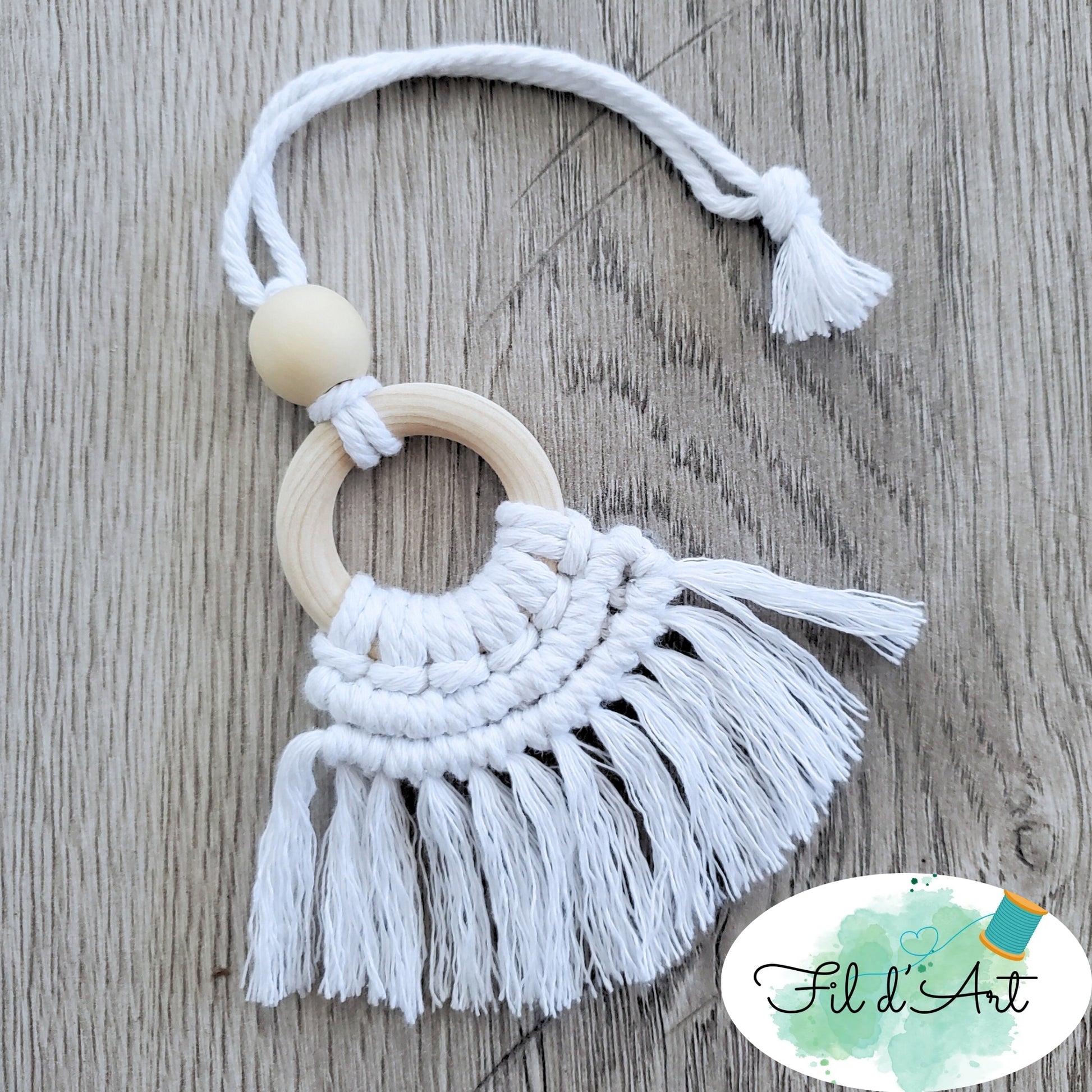 Diffuseur en macramé blanc fabriqué par Alicia 10 ans. Diffusez une odeur agréable en y mettant quelques gouttes d'huile essentiel qui vous fera vous sentir bien. Garder cette odeur près de vous en accrochant ce mignon diffuseur de style boho sur votre lampe de travail, poigné de porte, rétroviseur de voiture...